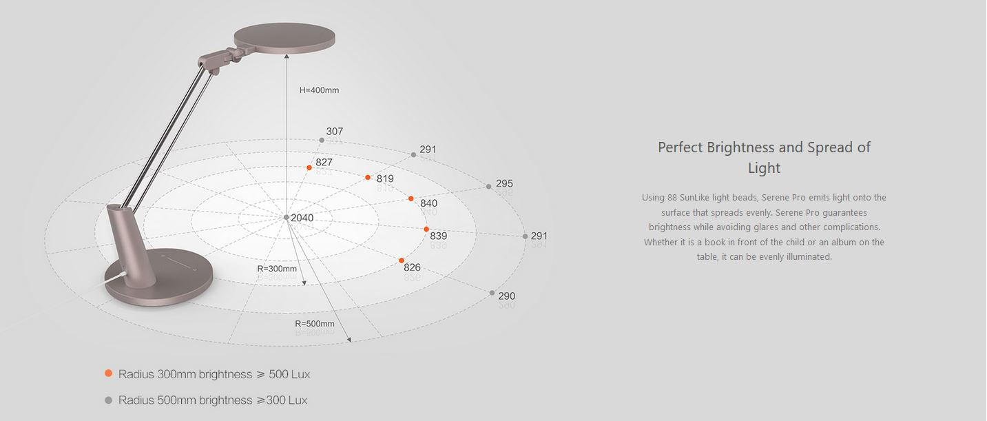 Using 88 SunLike light beads, Serene Pro emits light onto the surface that spreads evenly. Serene Pro guarantees brightness while avoiding glares and other complications. Whether it is a book in front of the child or an album on the table, it can be evenly illuminated.