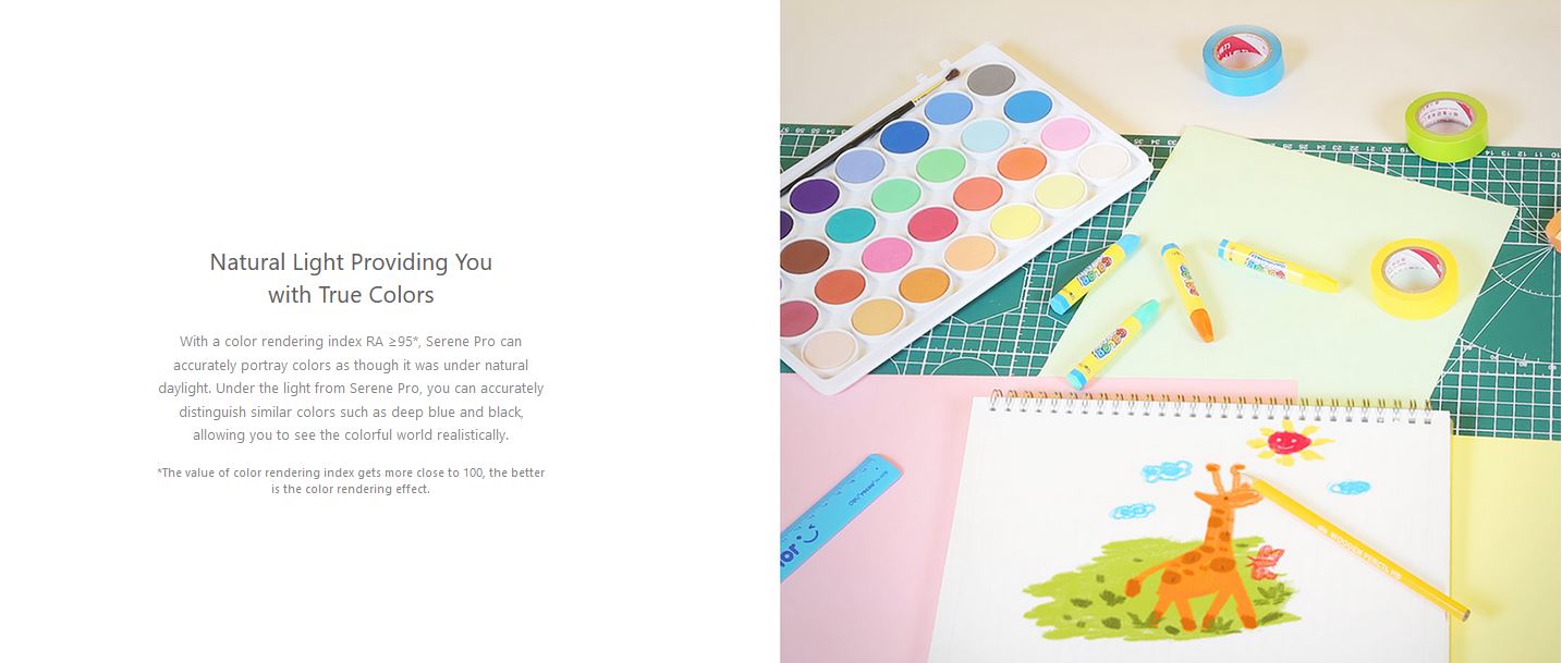 With a color rendering index RA ≥95*, Serene Pro can accurately portray colors as though it was under natural daylight. Under the light from Serene Pro, you can accurately distinguish similar colors such as deep blue and black, allowing you to see the colorful world realistically.