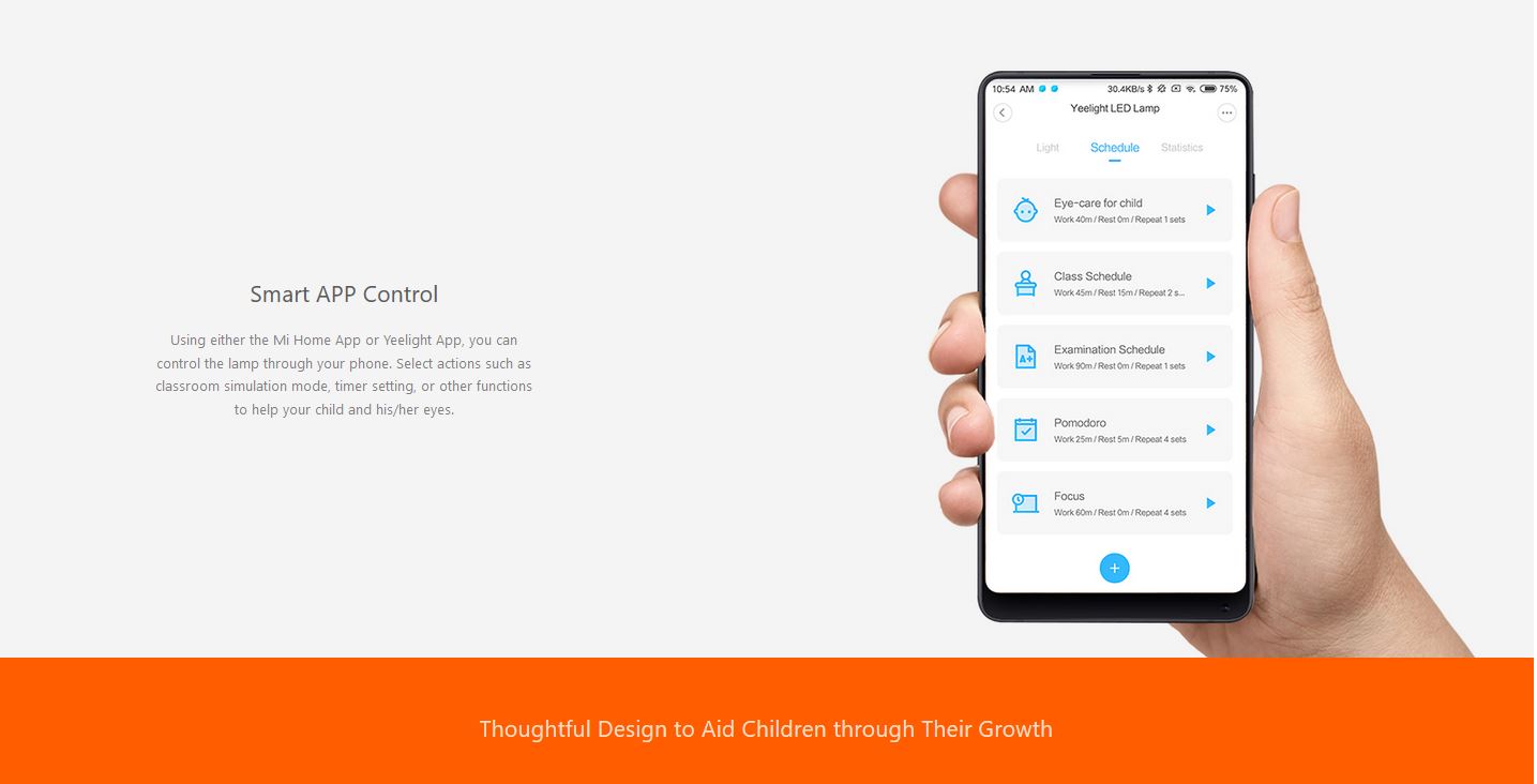 Using either the Mi Home App or Yeelight App, you can control the lamp through your phone. Select actions such as classroom simulation mode, timer setting, or other functions to help your child and his/her eyes.