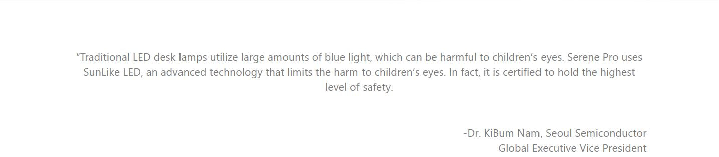 Children are naturally curious beings, which results in them often being busy in their own crafts and forgetting to take breaks. Serene Pro solves this by including a “timer light” button. By holding this button for 2 seconds, it will initiate the protection setting so it gently dims and brightens after a preset period of time to alert the child that it is time to take a break. This helps protect the eyes and create good study habits for the child.