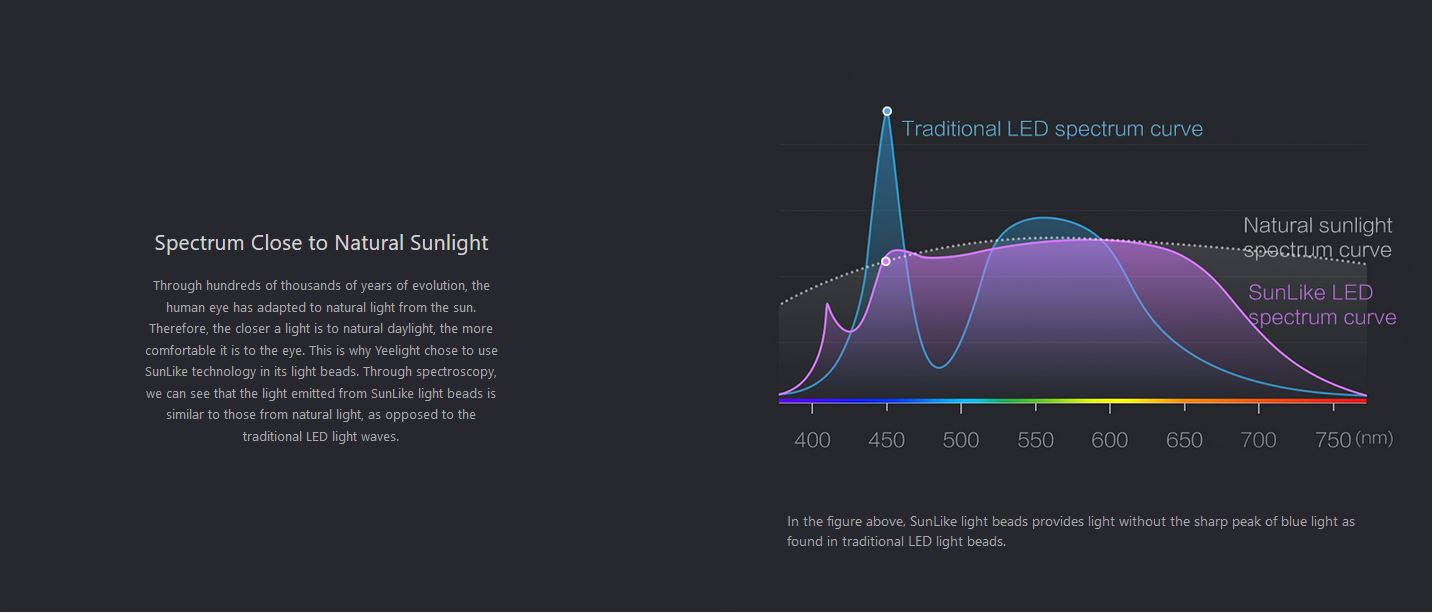 Through hundreds of thousands of years of evolution, the human eye has adapted to natural light from the sun. Therefore, the closer a light is to natural daylight, the more comfortable it is to the eye. This is why Yeelight chose to use SunLike technology in its light beads. Through spectroscopy, we can see that the light emitted from SunLike light beads is similar to those from natural light, as opposed to the traditional LED light waves.