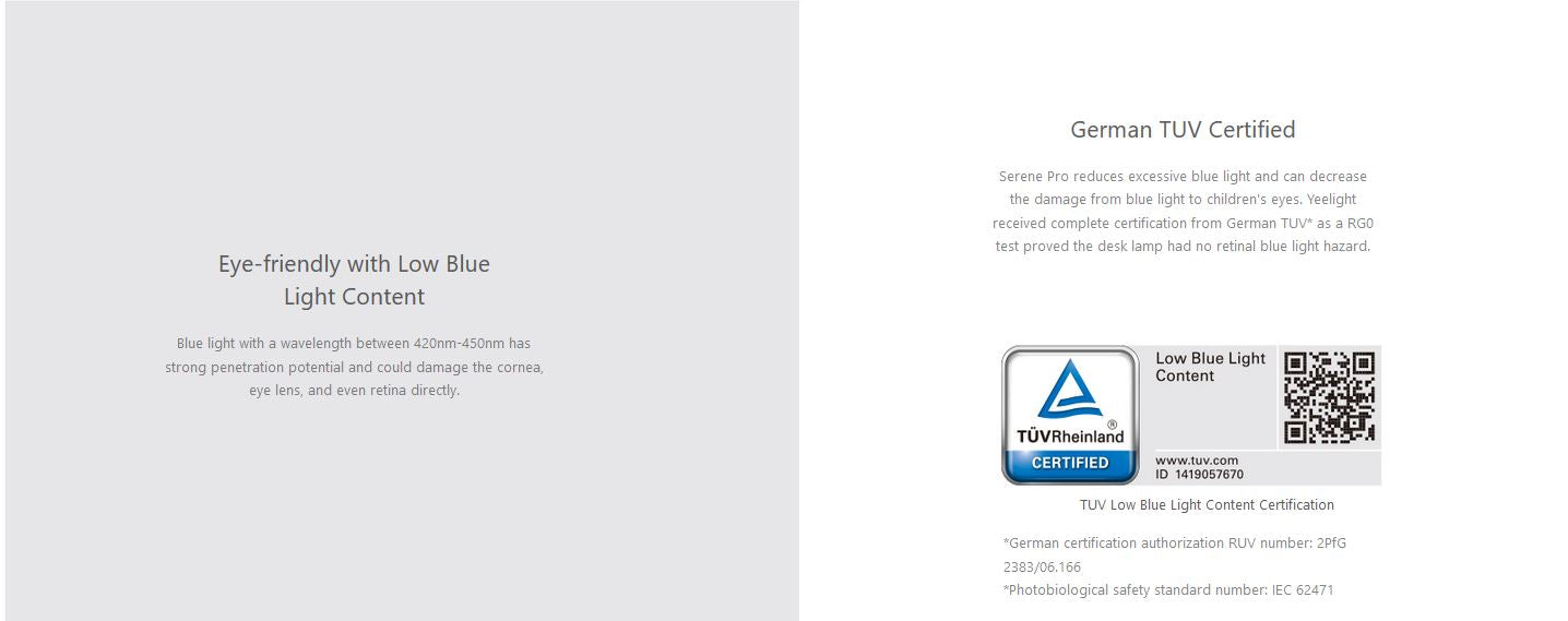 Serene Pro reduces excessive blue light and can decrease the damage from blue light to children’s eyes. Yeelight received complete certification from German TUV* as a RG0 test proved the desk lamp had no retinal blue light hazard.