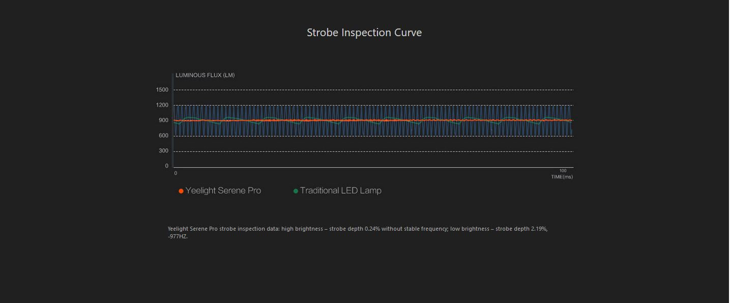 Yeelight Serene Pro strobe inspection data: high brightness – strobe depth 0.24% without stable frequency; low brightness – strobe depth 2.19%, -977HZ.